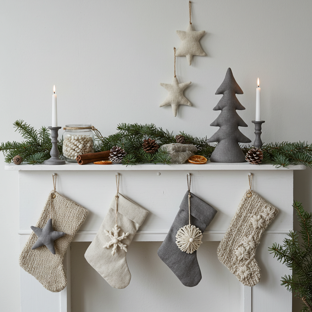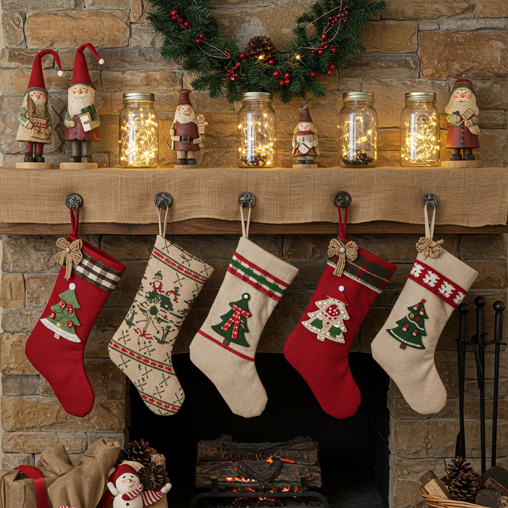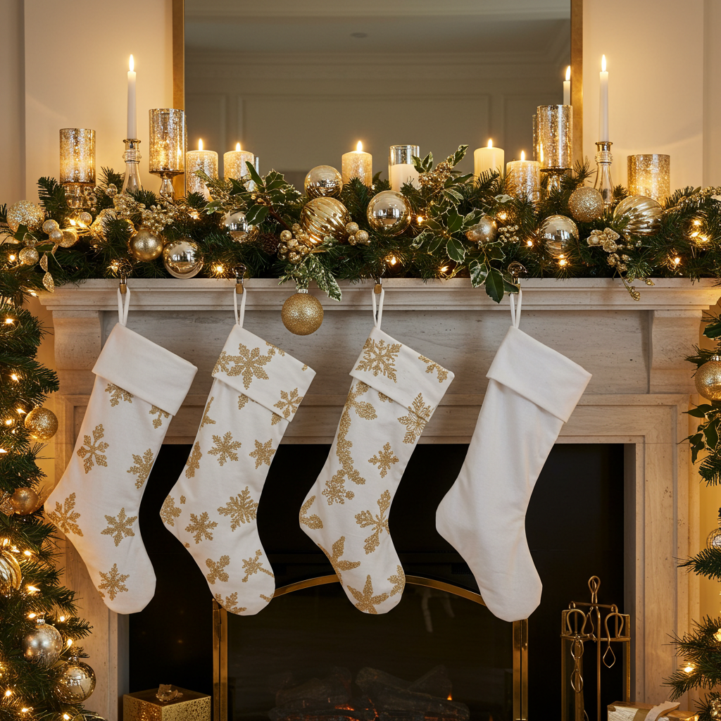 To achieve an elegant look on your mantel, start with a neutral base using white or cream stockings complemented by gold or silver accents. Layer in sparkling ornaments in varying sizes—think metallic baubles and crystal-like decorations that catch the light beautifully. Incorporate candles of different heights for added ambiance; they create a warm glow that invites cozy gatherings. Finally, finish off with lush greenery like eucalyptus or fir branches intertwined throughout the display for a pop of color and texture.