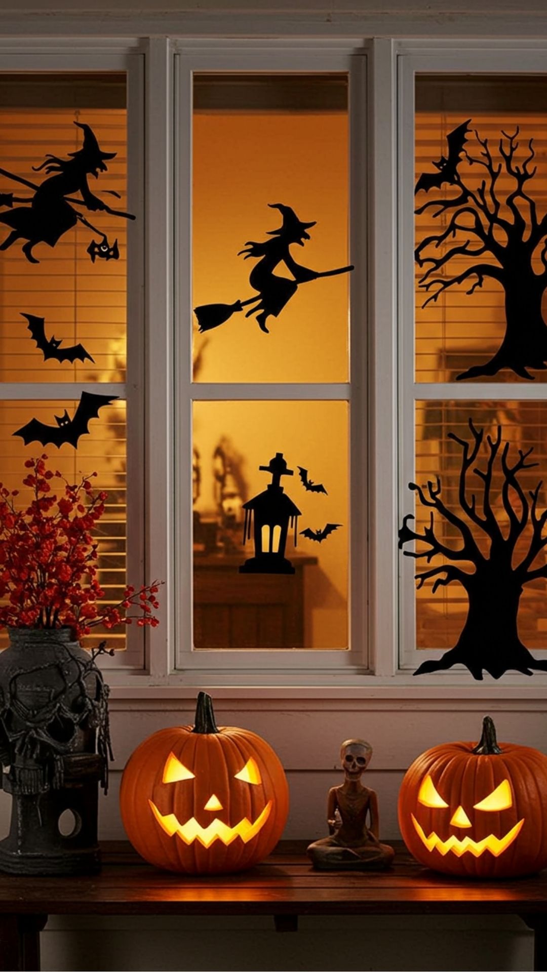 For this project, cut out spooky shapes—think witches flying on brooms or eerie trees—from black cardboard or foam board. Use double-sided tape to attach these cutouts against your windows to cast creepy shadows when backlit by indoor lights. This simple yet effective decoration provides an air of mystery without overwhelming your porch decor.