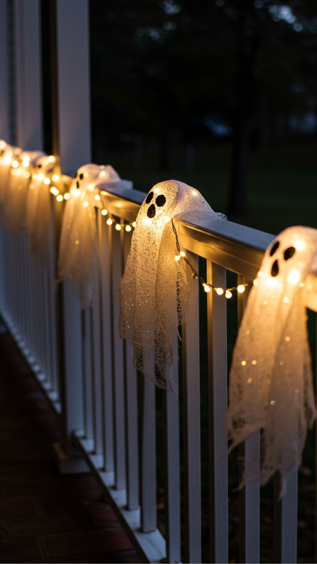 To make these lights shine bright without being too scary, buy clear globe string lights; wrap them tightly with cheesecloth until you have ghost-like forms appearing all along your porch railing! For extra sparkle (and festivity), sprinkle some craft glitter over them before securing everything down tight—it’ll shimmer beautifully whenever someone passes by!