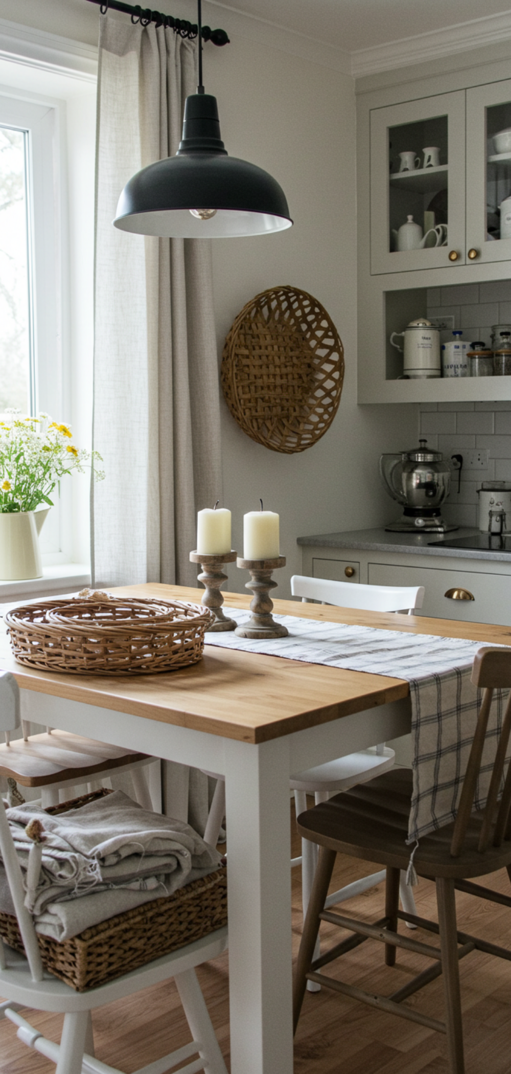 Incorporate cozy textiles like woven baskets, linen towels, and plaid table runners to enhance comfort in your kitchen space. After adding some soft linen curtains to my windows, I noticed how they softened the room’s overall look—guests often tell me it feels like stepping into a warm embrace when they enter.